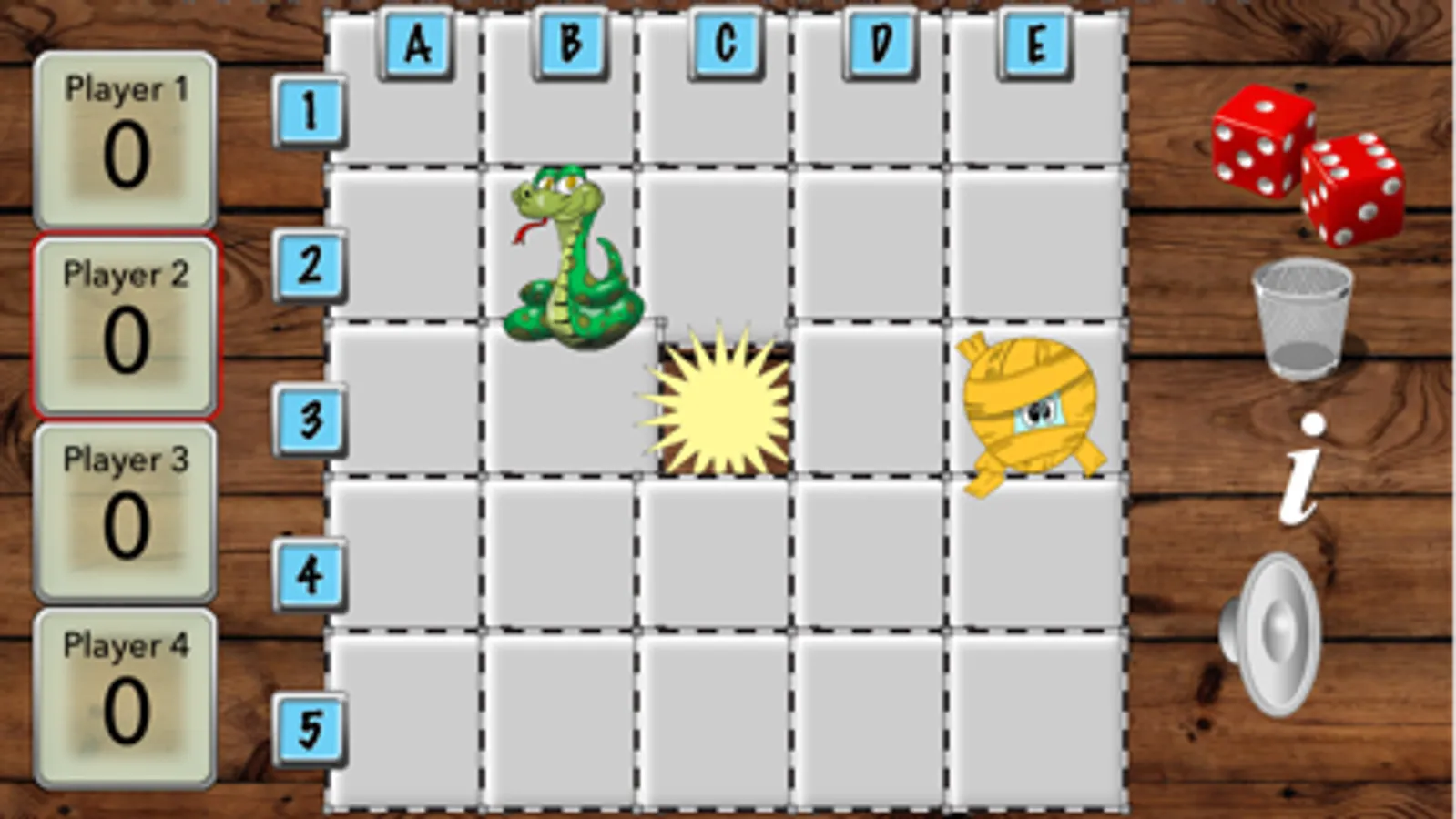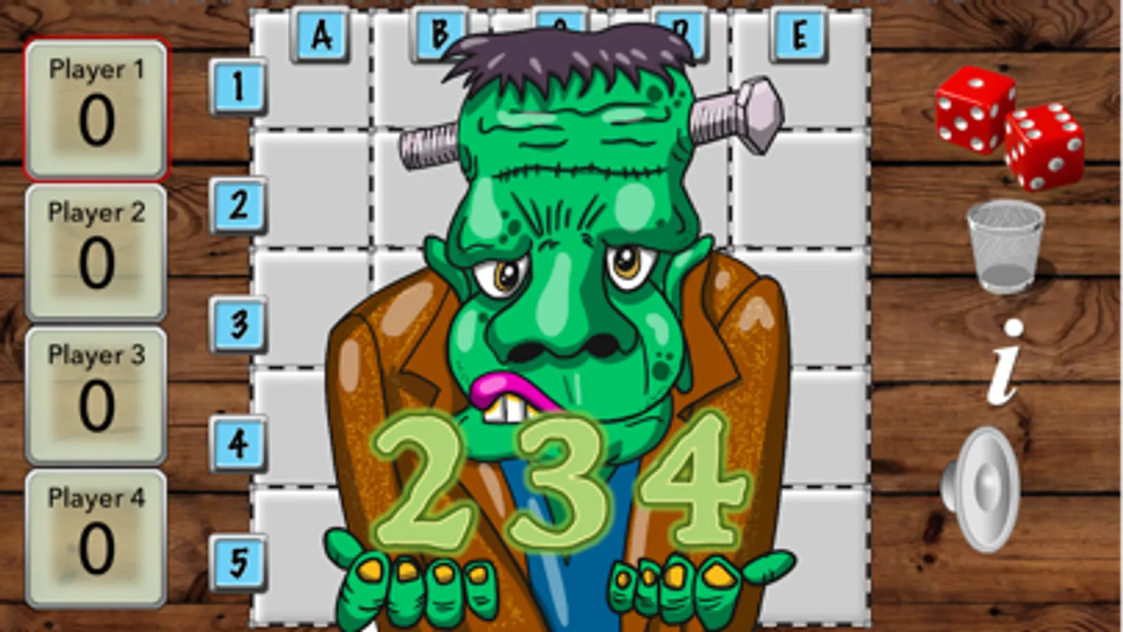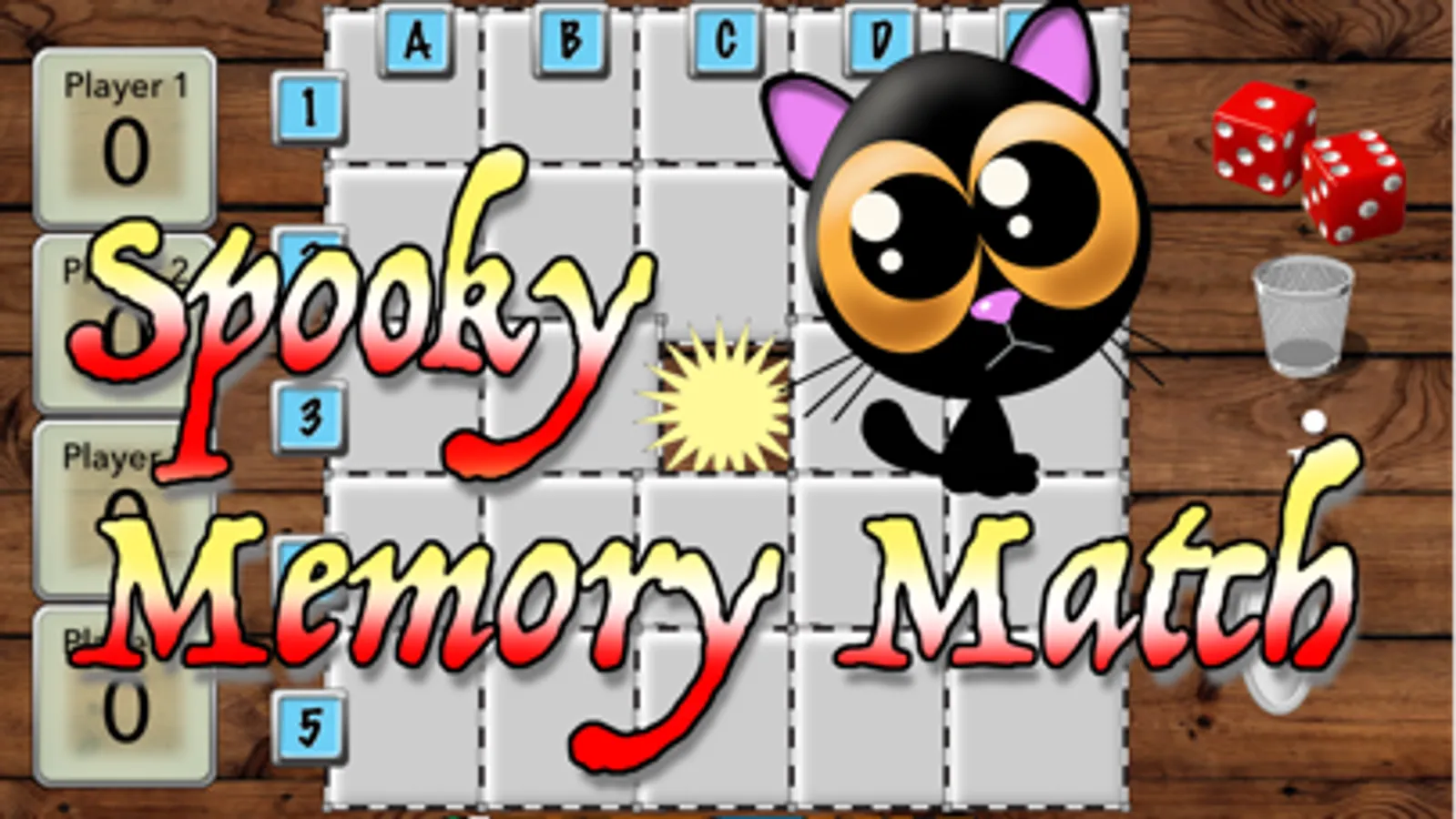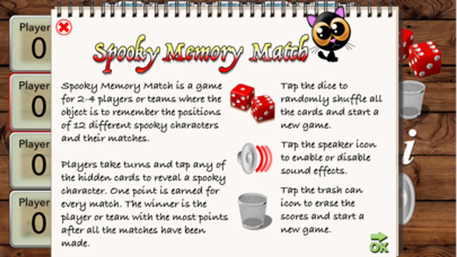 Sppoky Memory Match is a game for 2-4 players or teams where the object is to remember the position of colorful spooky characters in order to make the most matches. Pairs of spooky characters are randomly placed in a 5x5 grid. Players take turns to select two facedown cards. Tapping a card reveals the hidden spooky characters. If the two spooky characters match the player scores a point and the cards stay faceup until the end of the game.