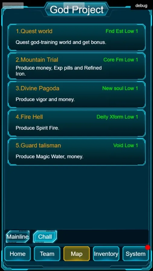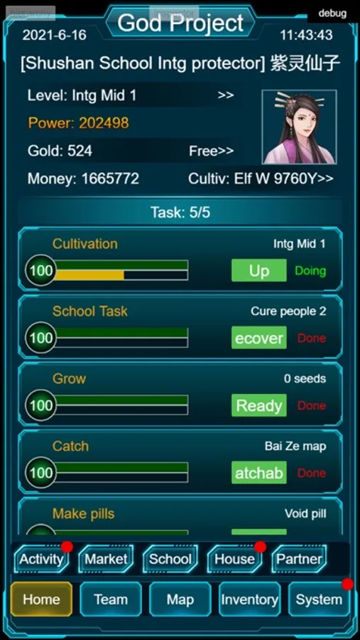 God Project is a text-based idle ascension game. You can idle while finishing missions like cultivation; dungeons; making pills, weapons and puppets; school tasks; learning skills; planting herbs; catching goblins at Map. Bonus can be got when online at specific time.