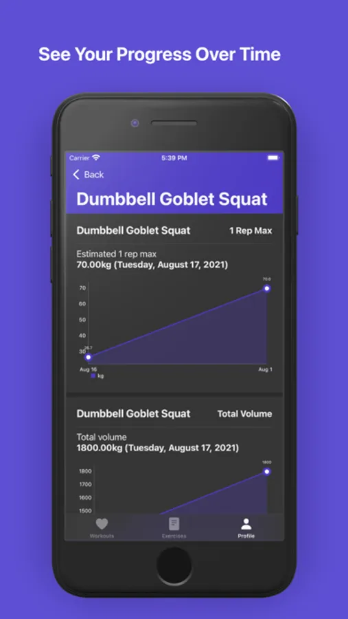 - Track your workout progress with graphs for 1rm and total volume progression.