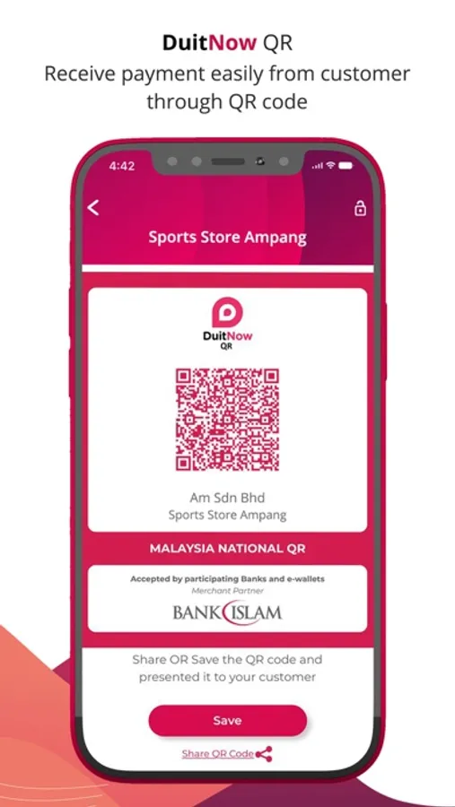 •DuitNow QR – generate a QR code for your customers or other people to pay you