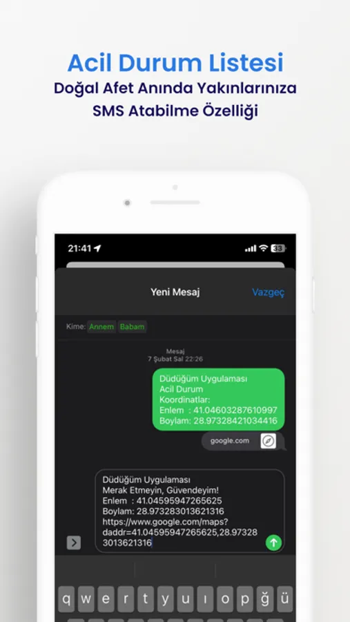 Enkaz altında iken veya Acil durumlarda düdük sesi çıkartarak konumuzun belirlenip, önceden belirlediğiniz numaralara SMS göndererek Güvende olup olmadığınızı bildirir. Uygulamamız reklam içermez. ve herhangi bir maddi gelir elde etmek veya veri toplamak amacı ile değil, insanlık namına yapılmış bir uygulamadır. Yorum ve eleştirilerinizi bu minvalde yaparsanız sevinirim.