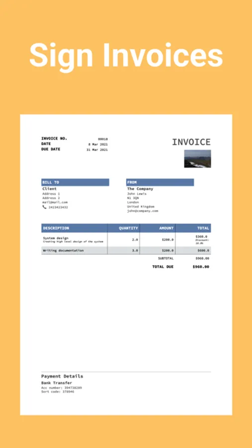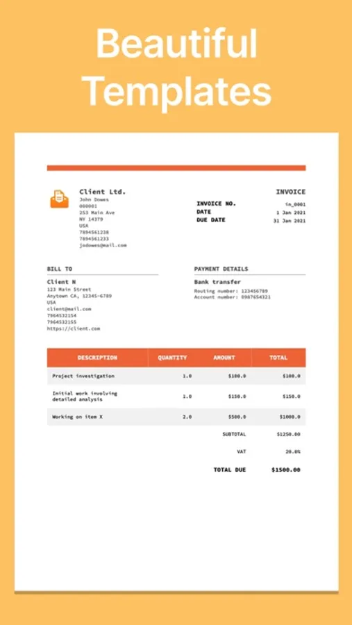 You can save your clients, businesses, signatures and payment methods so they can be re-used for another invoices. It is also possible to select different PDF templates for your invoices. Once finished you can save your PDF invoice file to iCloud or export it to any other app.