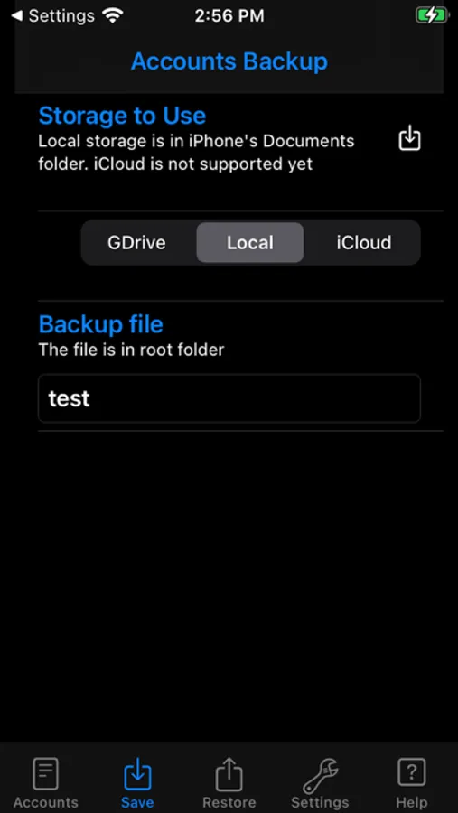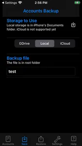 1. Account backups to local iPhone filesystem, iCloud or Google Drive storage.