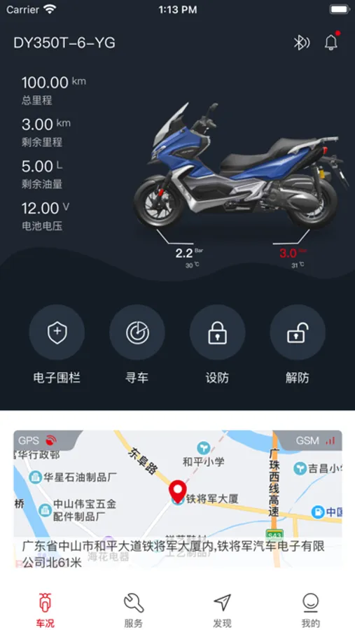 车况:总里程、剩余里程、剩余油量、胎压信息、电子围栏、寻车、设防、解防、车辆定位、骑行信息;