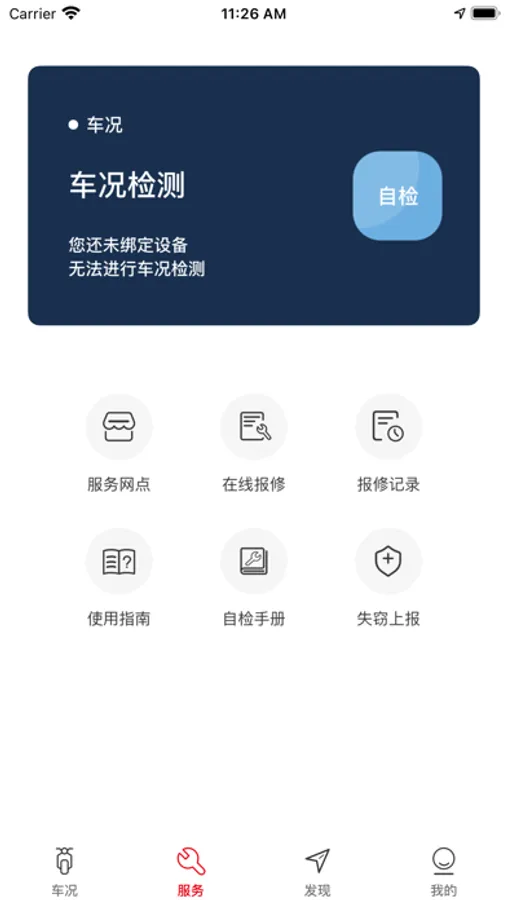 服务:车况检测、服务网点、在线报修、报修记录、使用指南、自检手册、失窃上报;
