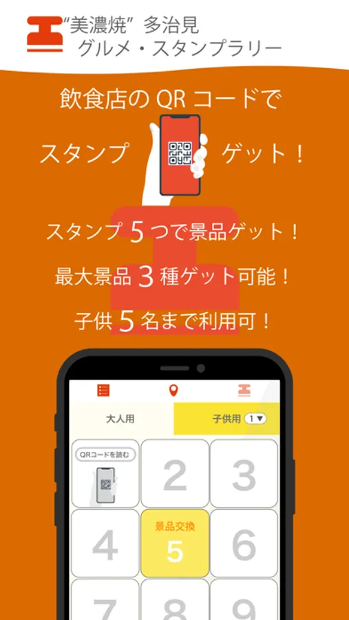 参加飲食店でQRコードを読み取ってスタンプゲット!スタンプ5つごとに1つ景品がもらえます。合計3種類の美濃焼がもらえるチャンスがあります。スマホをお持ちでないお子様も5人まで利用できます。景品が無くなり次第終了。多治見市の飲食店探しにも便利!