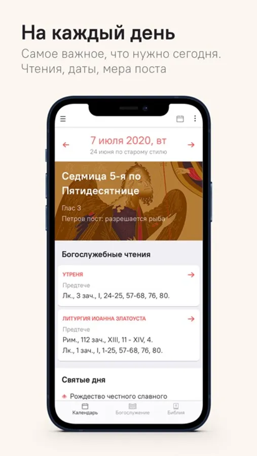 Приложение состоит из двух основных разделов — «Календарь» и «Богослужение».