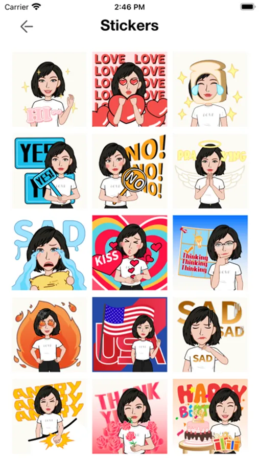 In addition, we also provide some stickers, which are a bit like Animoji for iPhone. These stickers use your avatar to express common feelings, such as: Hi, Love, Crying, Fire, Sad, Angry, Thank You, Sorry, WTF, Super Bowl, Morning, Good Night, Scared, Singing, OMG and so on.