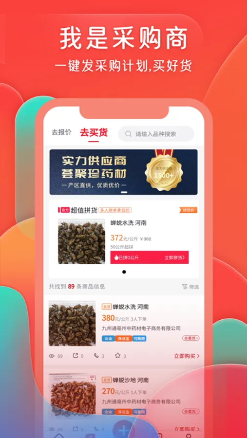 提供现货采购和超值拼货,可根据供应商类别、信用、是否接受账期、是否道地药材等原则,为中药饮片生产企业、食品保健品生产企业、批发商等提供优质货源。同时,买家还可邀请他人一起拼货,享受超值低价!