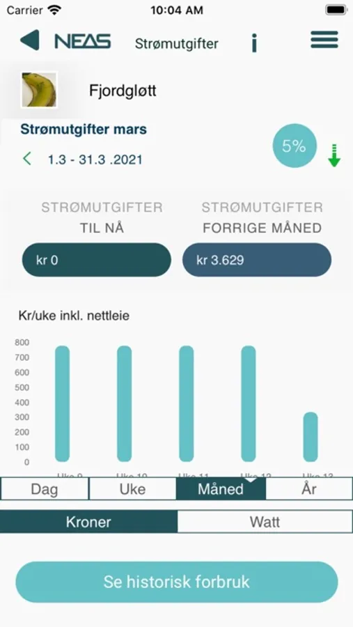 Her kan du velge å se ditt strømforbruk og kostnader i forskjellige tidsintervaller.
