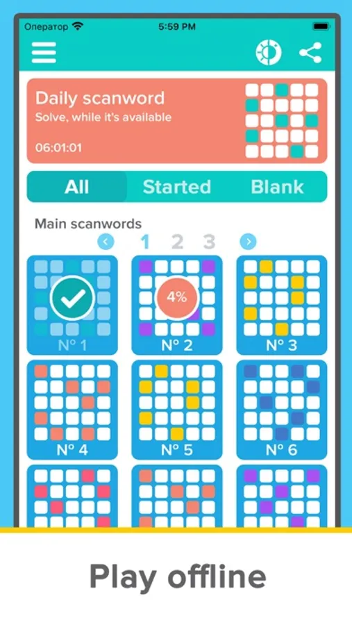 Collection of scanwords without the Internet, puzzles for every day. Spend time with the benefit of the mind, check your erudition, find out all the questions and answers. Play for fun and without limits: you can start solving any scanword and use an unlimited number of clues.