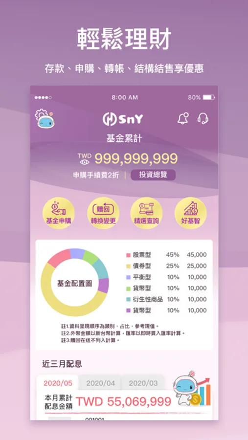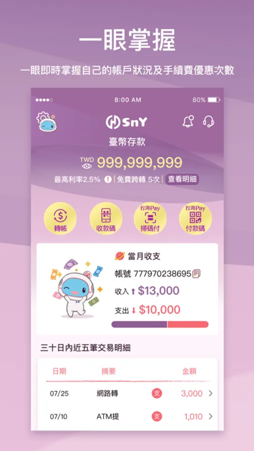 『華南銀行_SnY』APP引入「減法思維」,為您打造一個簡單實用又富有內涵的使用者介面,主動過濾可能會被干擾的雜訊,讓您能一眼即時掌握自己的帳戶狀況及手續費優惠次數等,並站在使用者的角度出發,主打快速收付、聰明消費、輕鬆理財等最常使用的功能,降低使用上的不便性,並有效的縮短搜尋功能的時間,打造出最貼近使用者需求的操作體驗。