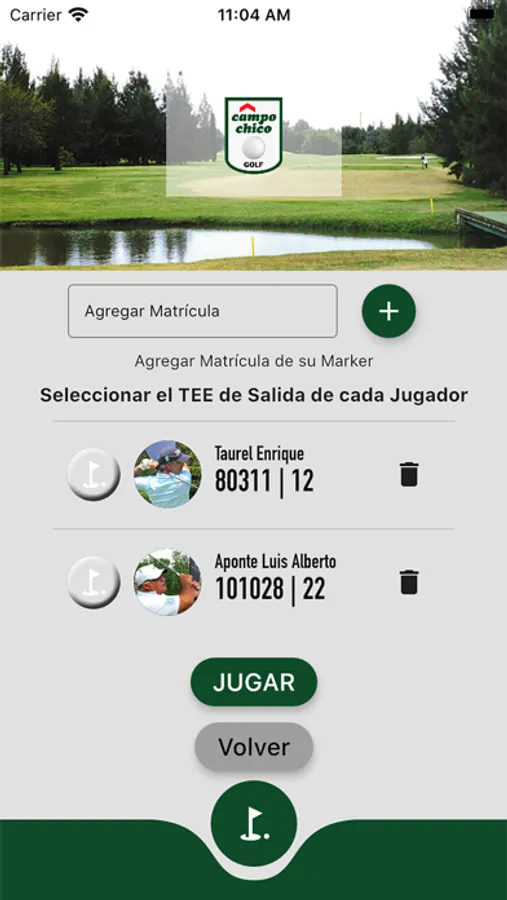 Ambas opciones acceden al menu Agregar Jugador, donde ingresara la matricula de su compañero de juego y seleccionara el tee de salida de cada uno.