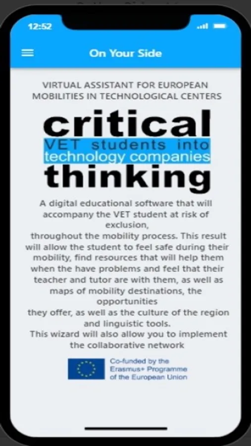 A digital educational software that will accompany the VET student at risk of exclusion, throughout the mobility process. This result will allow the student to feel safe during their mobility, find resources that will help them when the have problems and feel that their teacher and tutor are with them, as well as maps of mobility destinations, the opportunities they offer, as well as the culture of the region and linguistic tools.