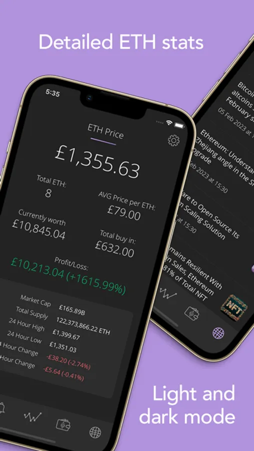High/low ETH Alerts (notifications), detailed stats, widgets, news, profit and loss stats and more.