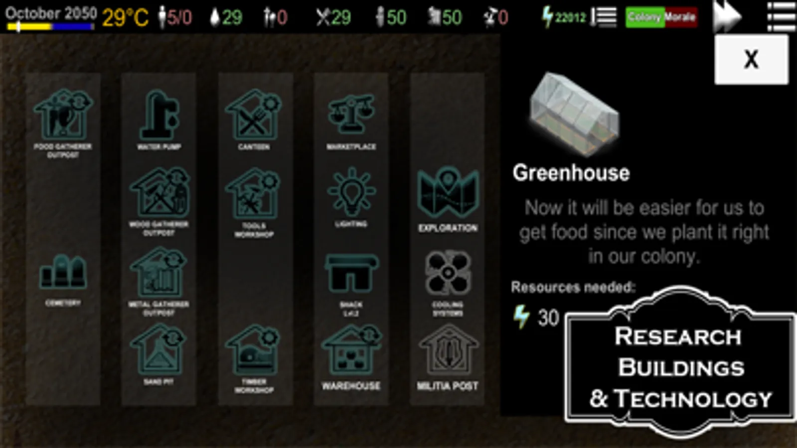 * Discover the big map around the colony and send research teams in missions to find a way for a better life.
