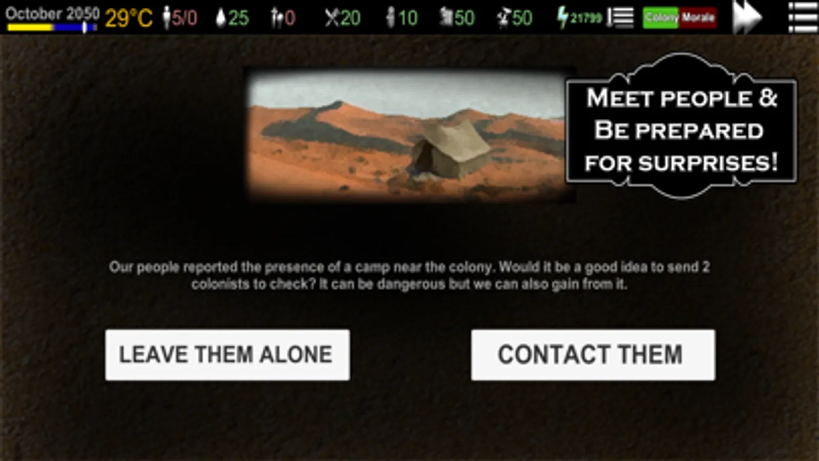 * Make wise decisions when your colonists ask for your opinion or ask for your help because the welfare and the future of the colony will depend on you.