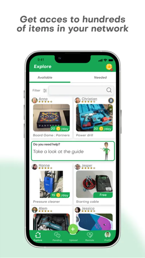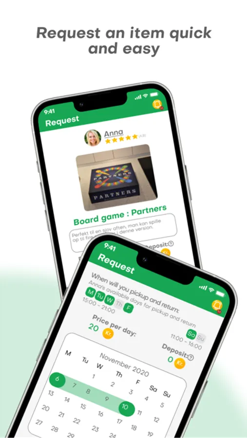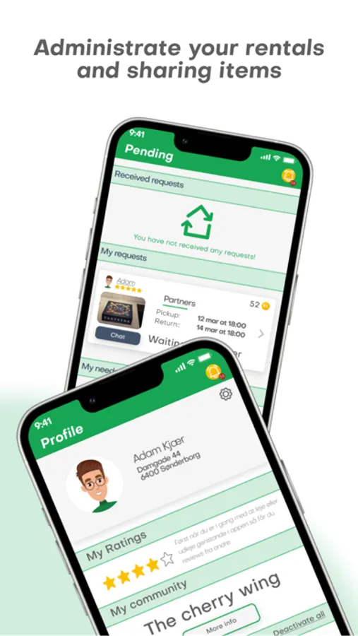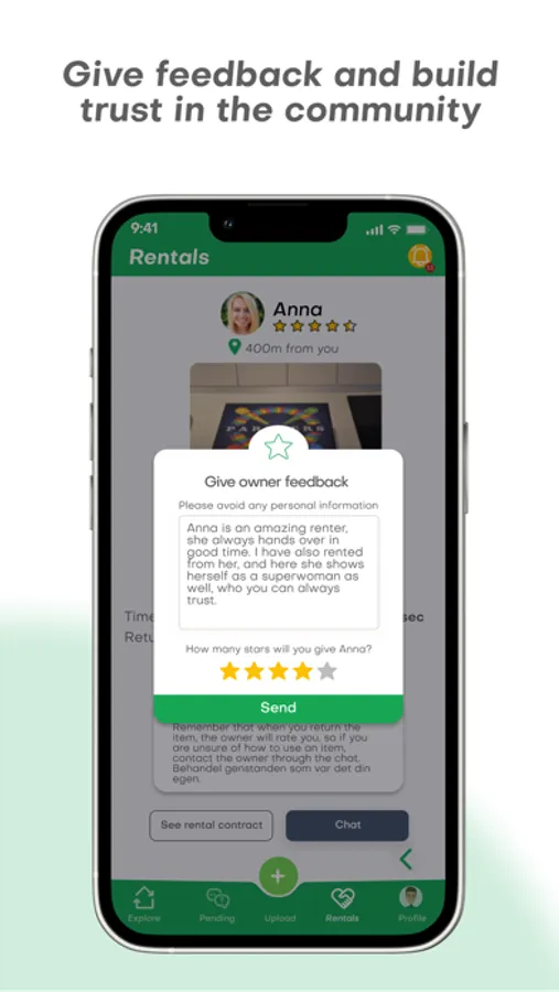 Your safety is at top priority for us! That's why the app automatically creates a rental contract with the ability to add extra notes before you start the rental with a simple swipe, this can be used as documentation for a relevant insurance (In Denmark your home insurance). Our in-app review system provides you with information about previous rental experiences from users, rated by the community. To further increase trust on our platform, both renter and item owner give each other reviews after each interaction.