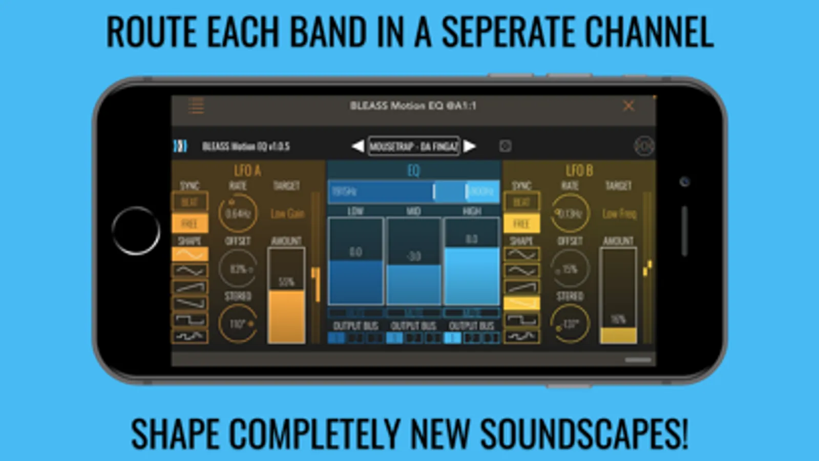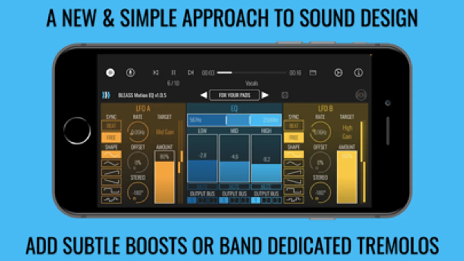 The creative possibilities are taken to a new level by BLEASS Motion EQ’s ability to send each band’s signal to its own output bus (with AUM)*. This makes the plugin operate like a crossover, allowing you to route each band to its own track for further processing and mixing.