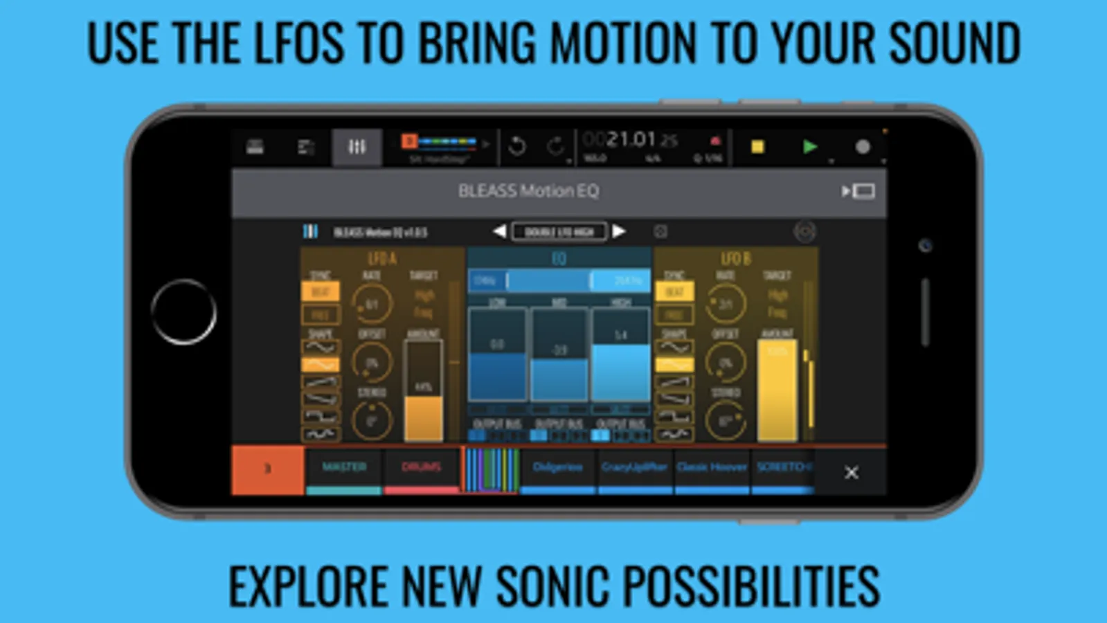 The motion part of BLEASS Motion EQ comes in the form of a pair of LFOs (Low Frequency Oscillators). These can control the frequency cutoff point of each band, as well as the amount of cut or boost that each band applies, allowing you to create swirling, ever-shifting tonal patterns. And with the LFOs Synced to your DAW, all manner of rhythmic tonal pulses and movements are possible.
