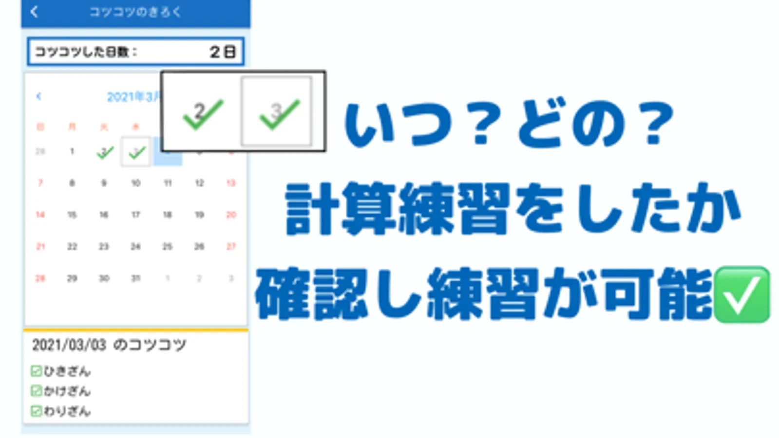 また、どれだけ計算練習を頑張ったがカレンダー形式で確認できますので、一緒に確認しながら、毎日コツコツがんばりましょう。