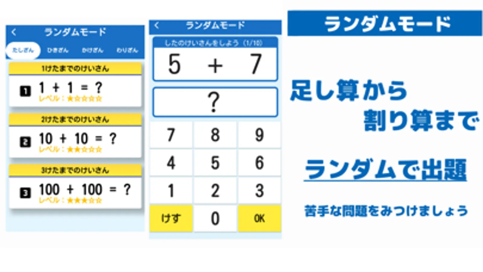 -足し算、引き算、掛け算、割り算の1桁から3桁までの計算問題をランダムで出題
