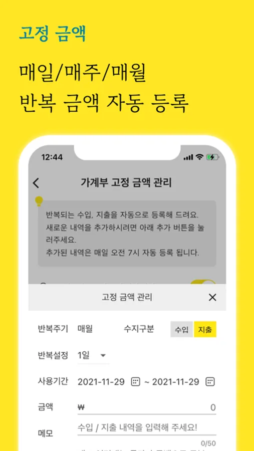 - 매년, 매월, 매주, 매일 등록되는 내용이 있다면 ? 고정 금액으로 등록해보세요