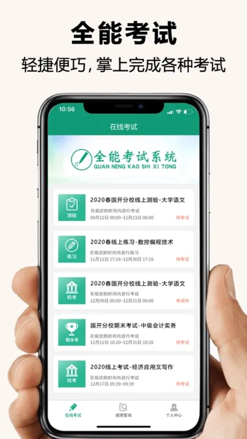 考生在APP能完成在线考试、查看成绩、设置个人信息;实现人脸识别验证技术,过程监控技术,通过拍照上传和附件实现主观题答卷,后台人工判卷等。