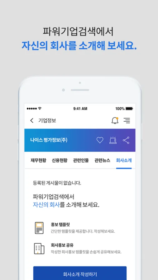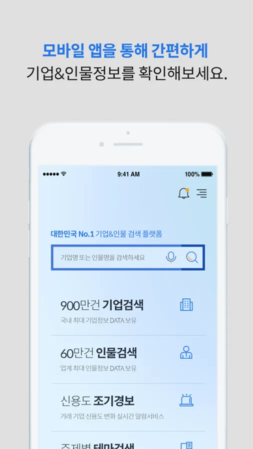 - 국내 최대의 개인/기업정보 서비스회사인 "NICE평가정보"에서 제공하는 기업/인물정보 조회용 모바일 어플리케이션