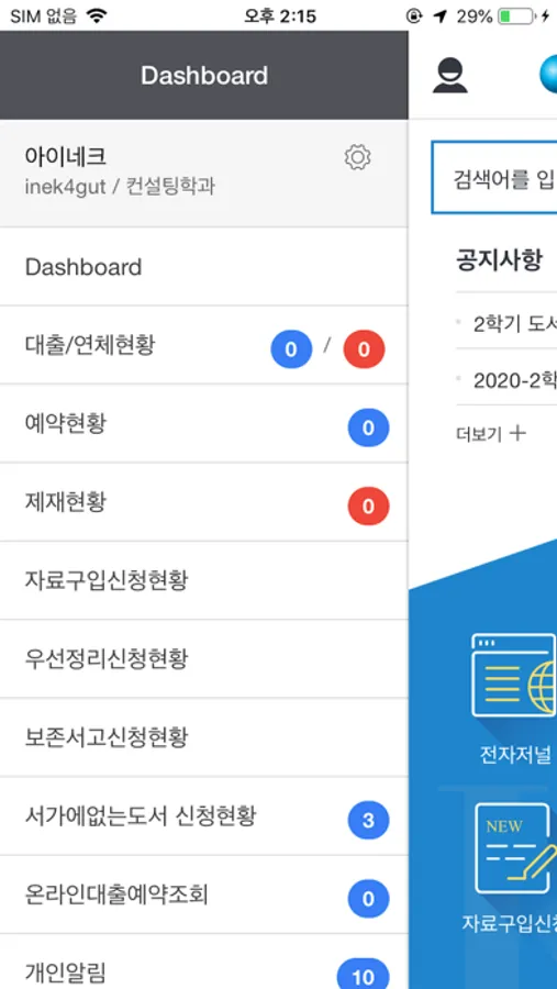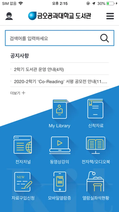 금오공과대학교 도서관 검색, 신간도서소개, 도서관이용안내, 공지사항 등 도서관 서비스를 제공하는 프로그램입니다.