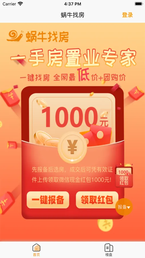 蜗牛找房,一手房置业专家,一键找房,全网最低价+团购价,先报备后选房,成交后可凭认购书上传领取微信现金红包1000元。