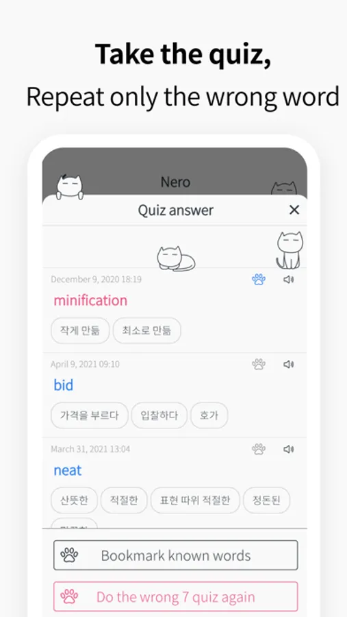 • At the end of the quiz, you can retest by collecting only the wrong words.