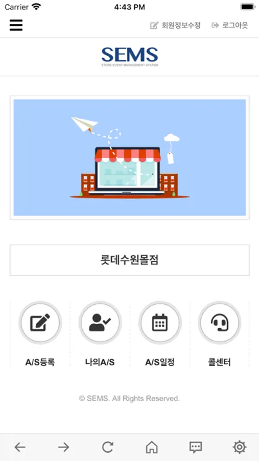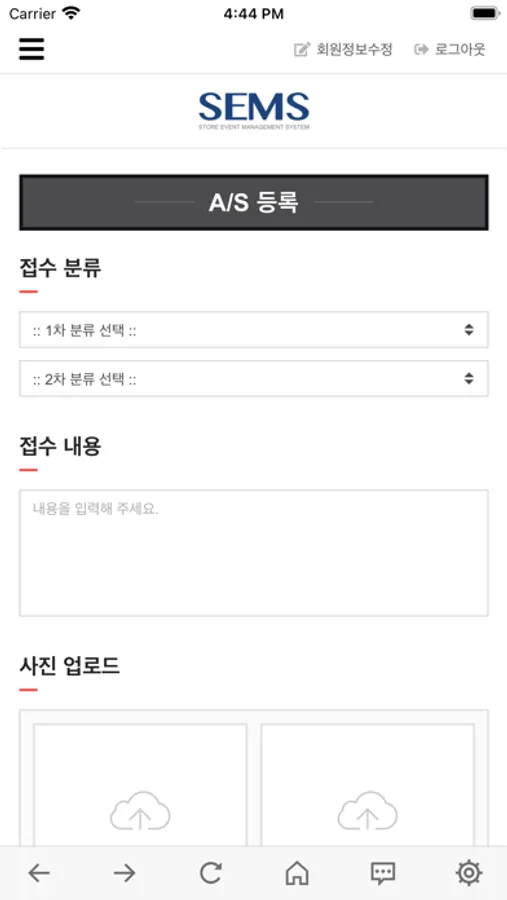 매장의 담당자는 SEMS관리 앱을 이용하여 A/S관련 이벤트가 발생할 경우, 이벤트 등록 메뉴를 통해 이벤트를 등록합니다.