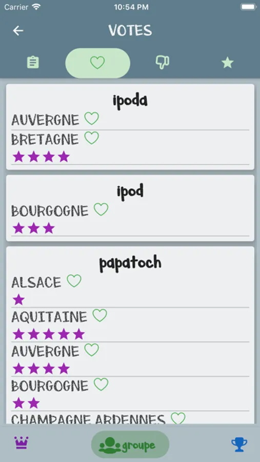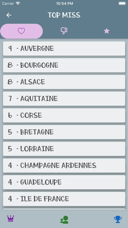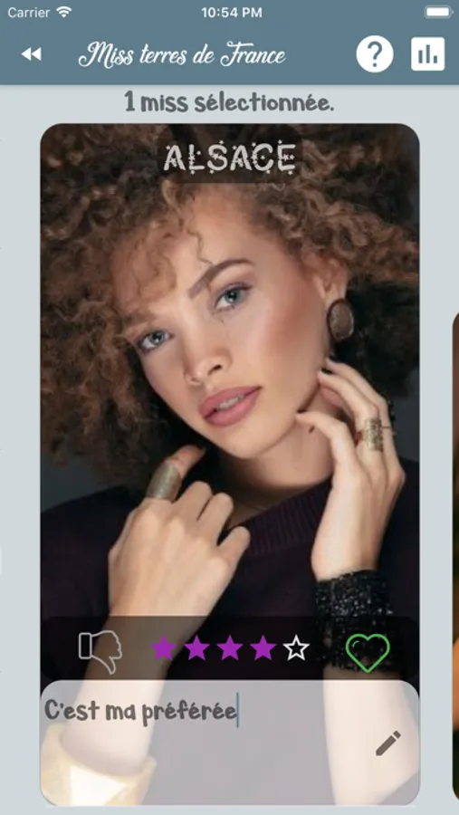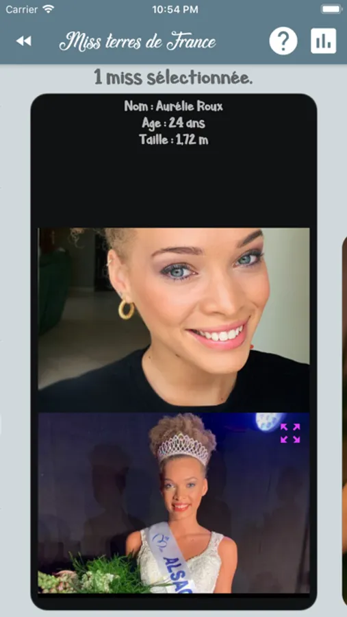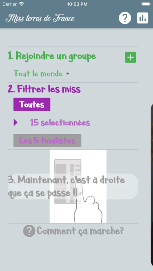 - Retrouvez les statistiques (miss préférées du groupe, la presonne du groupe ayant trouvé le plus de miss sélectionnées...) dans le menu dédié