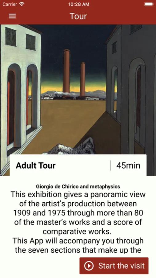 This APP provides an itinerary for a visit exploring the anthological exhibition De Chirico and Metaphysics, staged in Pisa in the rooms of Palazzo Blu from 7 November 2020 to 9 May 2021. A review that retraces the continuously evolving research of the Master from Volos, relating it by means of a long passage through images and words, a journey made up of departures and returns. This is an exhibition that allows de Chirico to be known through a series of revelations that raises the curtain on his enigmas, enabling access to his labyrinthine proscenium. One of the main elements of the project is the discovery of the artist’s personal collection, a selection of “de Chirico’s de Chirico” that forms the crux of this exhibition, from La Galleria Nazionale in Rome - donated by the painter's wife Isabella in 1987 - and the Fondazione Giorgio e Isa de Chirico.