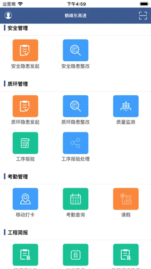 本应用主要服务于湖北交投鹤峰东高速,具备日常考勤/请假等基础功能以及施工检测中的工序/隐蔽工程/质量/安全隐患等上报和审批处理,同时可支持多维度报表查看,实现对进度的掌控。