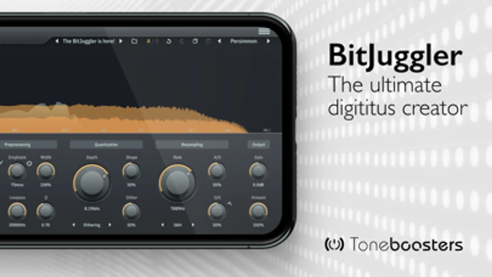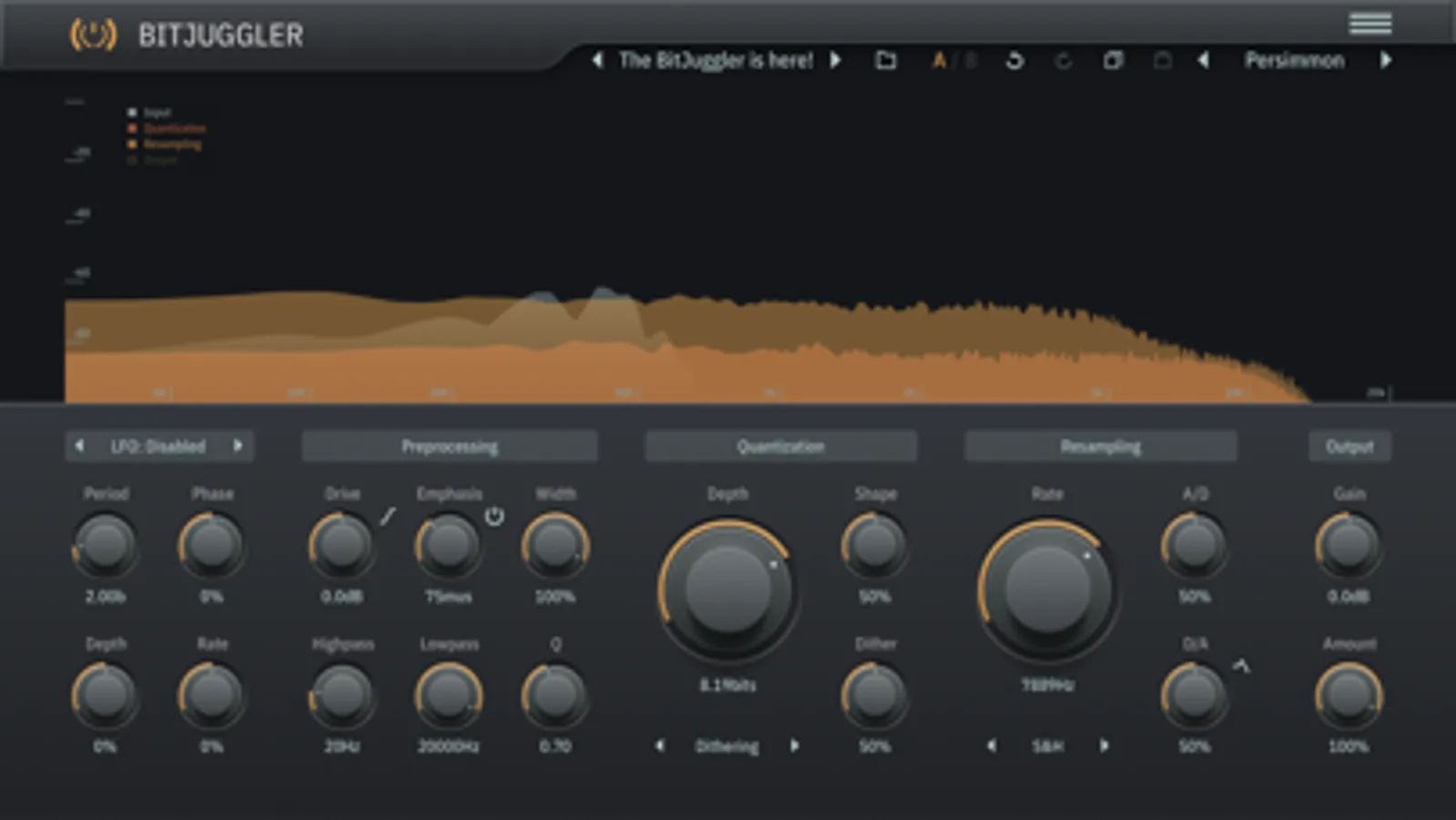 BitJuggler ads options for pre- and post emphasis for digital clipping, quantization and resampling to provide unique capabilities to further shape the effect of the bit crushing process.
