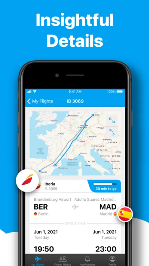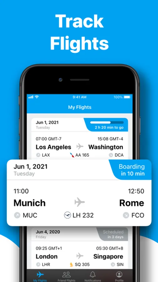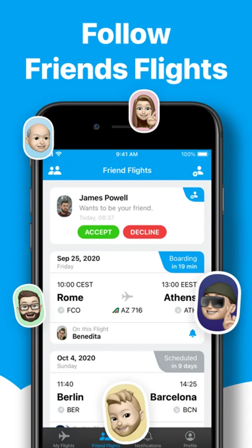 With Mileways, you have all the information about your own and your friend's flights in one place, right when you need it. Traveling has never been easier – get real-time notifications about delays, gate changes, weather conditions, and more!