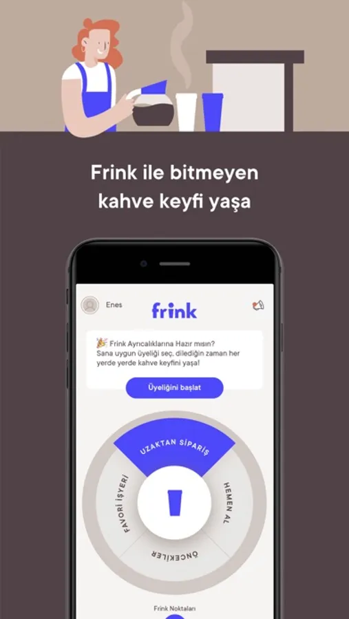 Frink, kahve severler ile kahve mağazalarını bir araya getiren ilk ve tek kahve üyeliği uygulamasıdır. Frink uygulamasında üyelik oluşturup ister uzaktan ister mağazada sipariş vererek yüzlerce Frink noktasında bitmeyen kahve deneyimini yaşamak şimdi çok kolay!