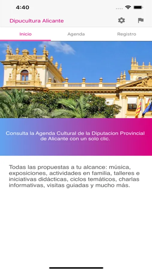 The Diputación de Alicante brings you culture through its Official App. Consult an extensive program of music, exhibitions, family activities, workshops, guided tours and much more.