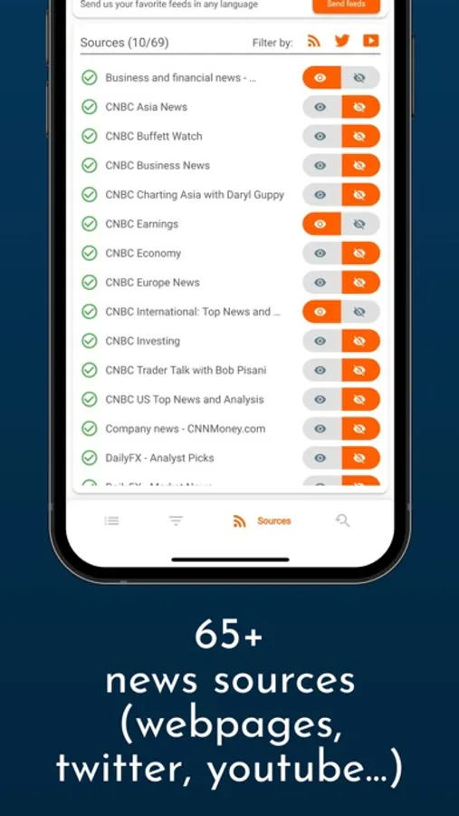 More than 65 different data sources, including websites, analysts, influencers from twitter and youtube channels related to financial market. The twitter sources are from news websites and important analysts of the stock market sector.