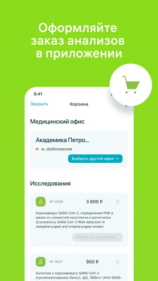 — Оформление заказа в приложении. Сделав предварительный заказ на исследования, можно вызвать мобильную службу для взятия анализов на дому.