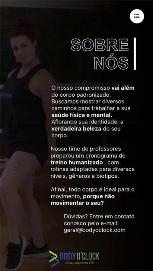 A Body é uma plataforma que oferece vídeo aulas de alto nível sobre diversas áreas da saúde física e mental das pessoas a partir de um treino humanizado. Aqui, você terá acesso a dezenas de aulas de Dance Clip, Ballefit, Funcional, Yoga Contemporâneo, Hiit, entre outros! Assista a aula, converse com o professor e marque uma aula presencial fazendo parte dessa movimento! Body O'Clock! O seu momento FIT!