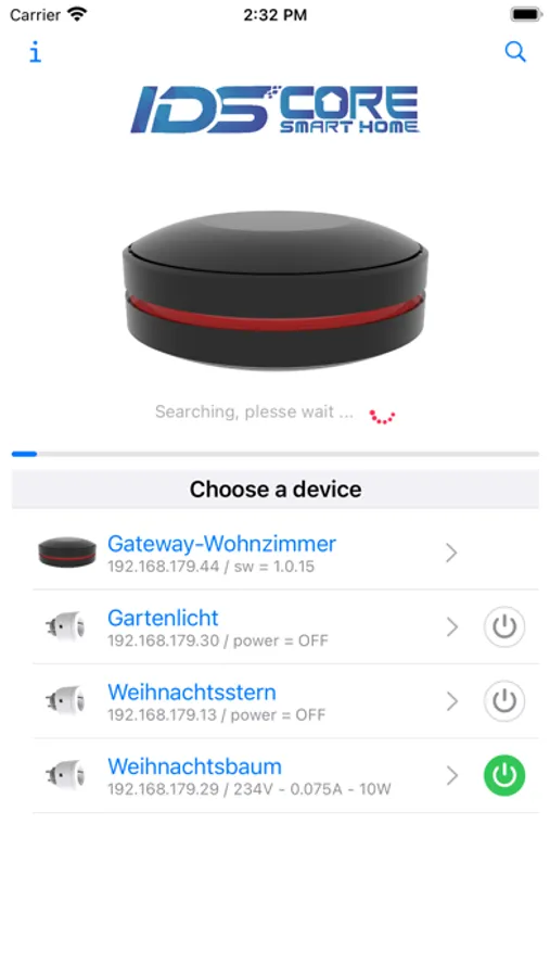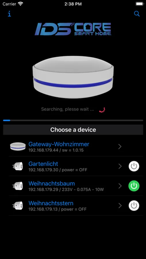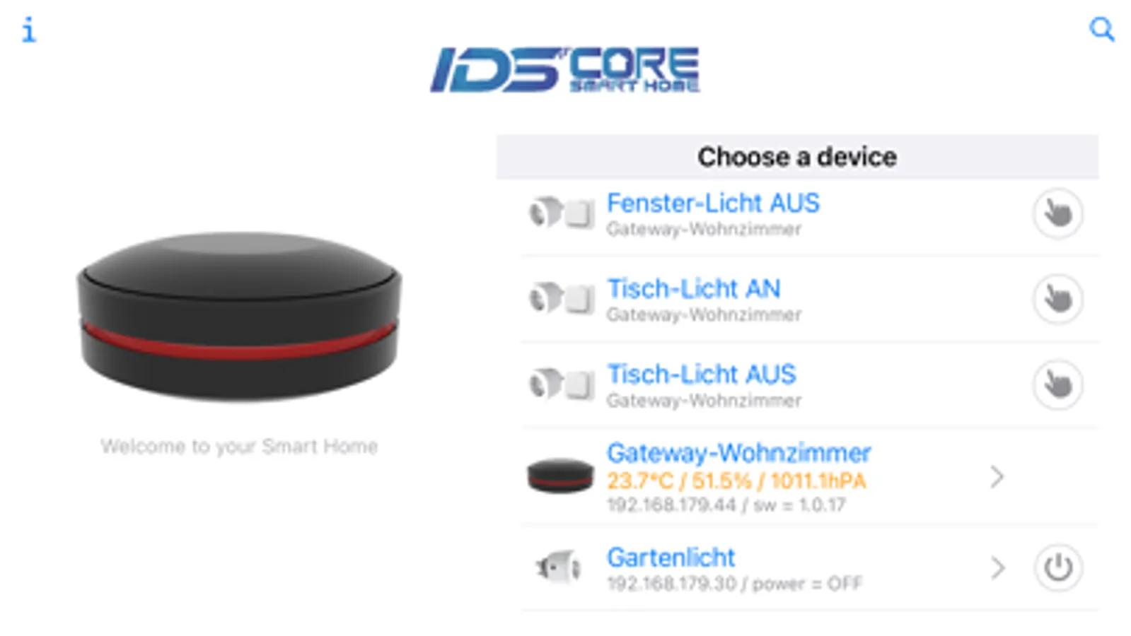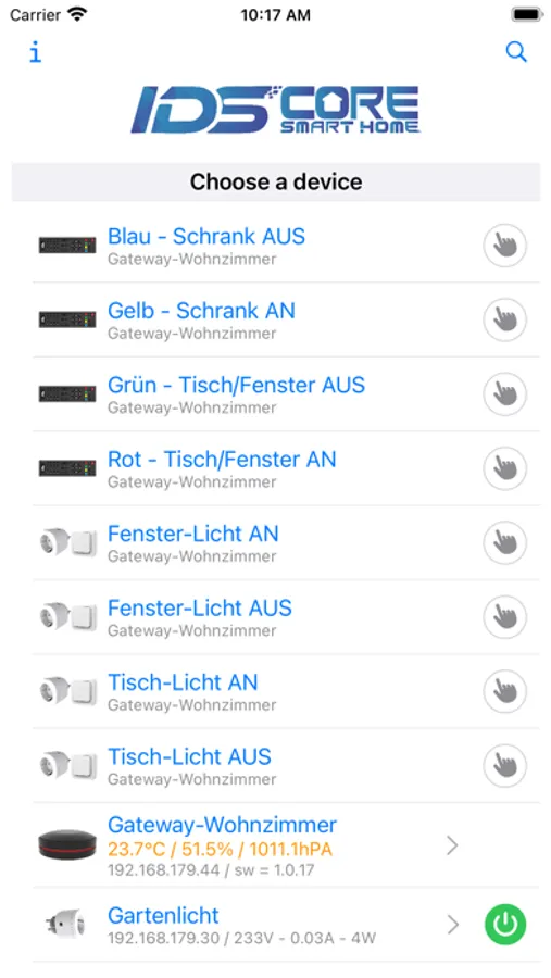 The app enables easy access to your IDS Core "Gateway V1" device to make settings and operation of connected Smart Home devices, devices with "Tasmota" SW can also be controlled.