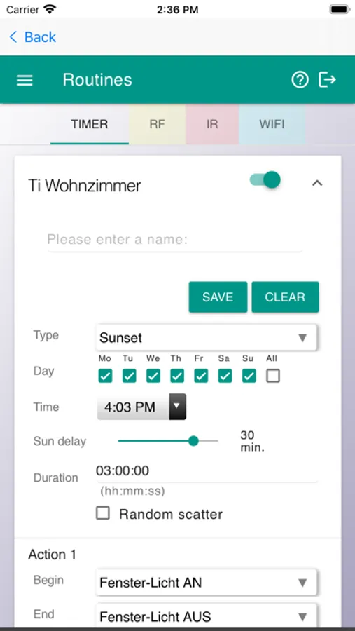 - Timer (single, weekdays, sunrise and sunset, temperature, humidity,
