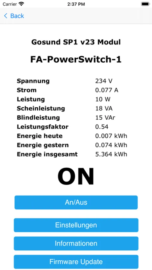 The "Gateway V1" / "Tasmota" devices are automatically found in the local network and the following functions are then available: