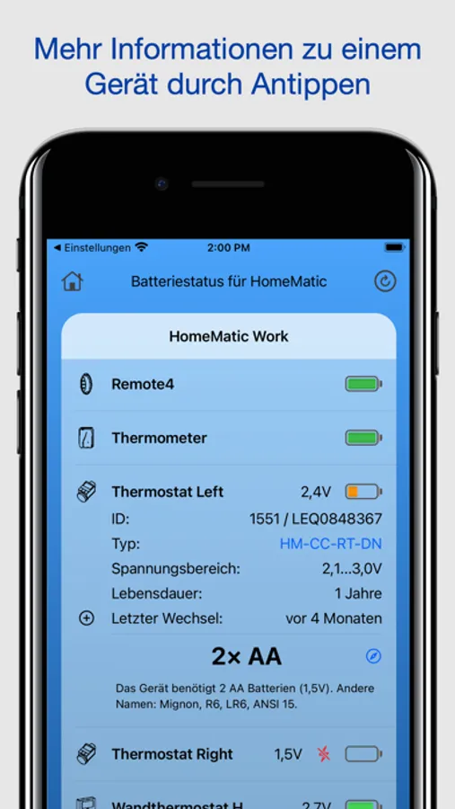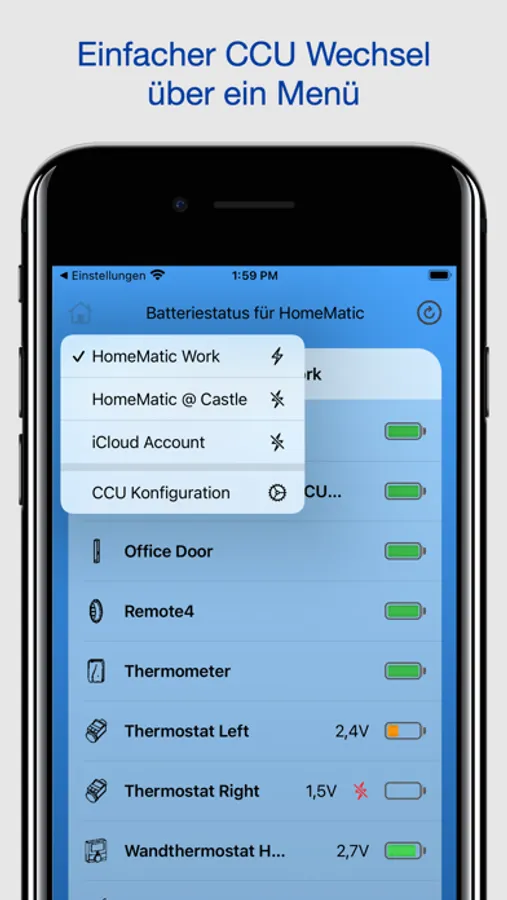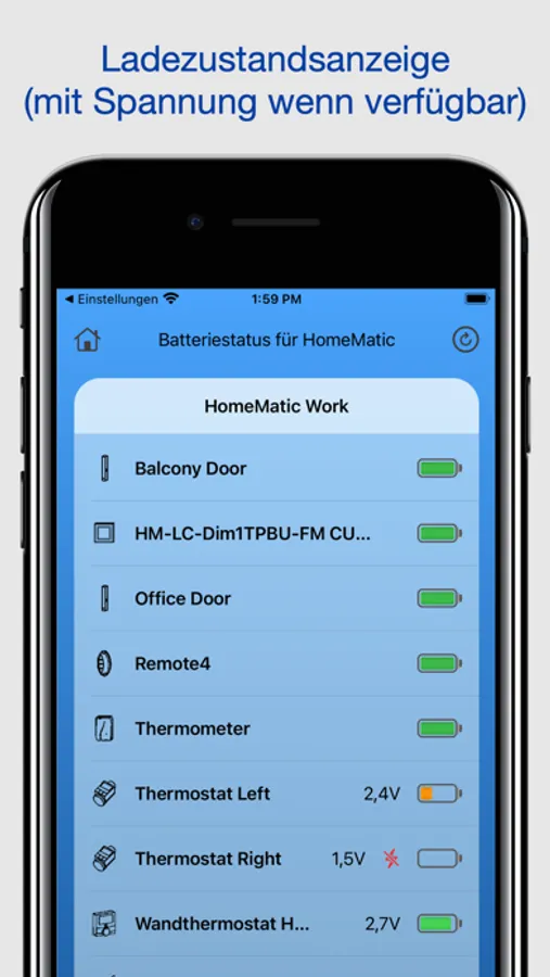 Battery Status for HomeMatic is a very simple application to report the status of your battery powered HomeMatic home automation devices.