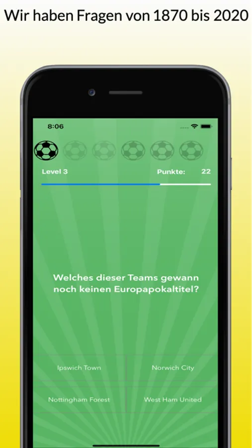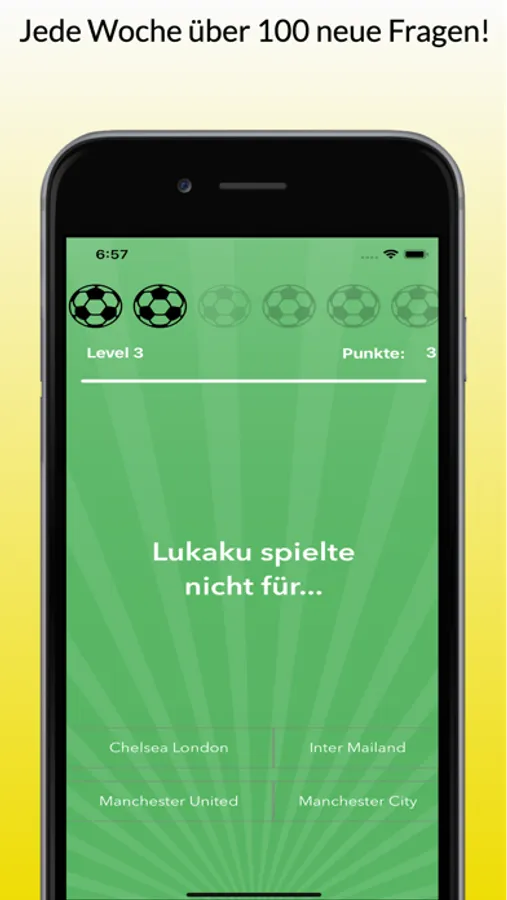 Es gibt Immer 7 (Beckham Style) Fragen pro Level. Am Anfang haben Sie zwei Leben. Weitere Leben werden mit Updates erfolgen.