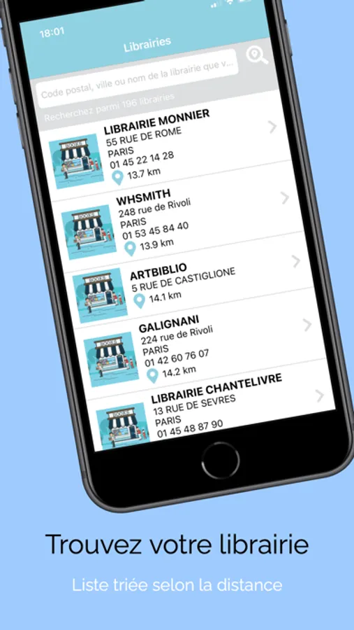 Cette application vous permet - en tant que lecteur - de voir la liste des librairies répertoriées dans l'application et de trouver celle la plus proche de chez vous. Vous pouvez ensuite consulter la fiche d'identité de la librairie, pour trouver ses coordonnées, et surtout avoir toutes les informations pour commander vos livres et les récupérer en Click & Collect.