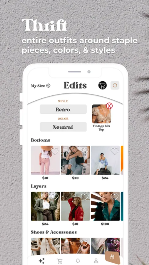 Not sure where to start? We’ve taken the work out of styling your sustainable outfits. Our one-of-a-kind Edits feature will deliver Tops, Bottoms, Layers, and Accessories around whatever Style and Color Palette you set to create entire outfits!